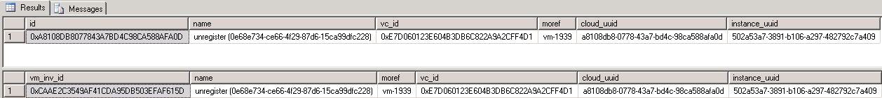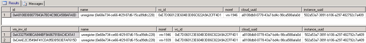 select id, name,vc_id ,moref, cloud_uuid,instance_uuid from vm where name like ‘%unregister%’