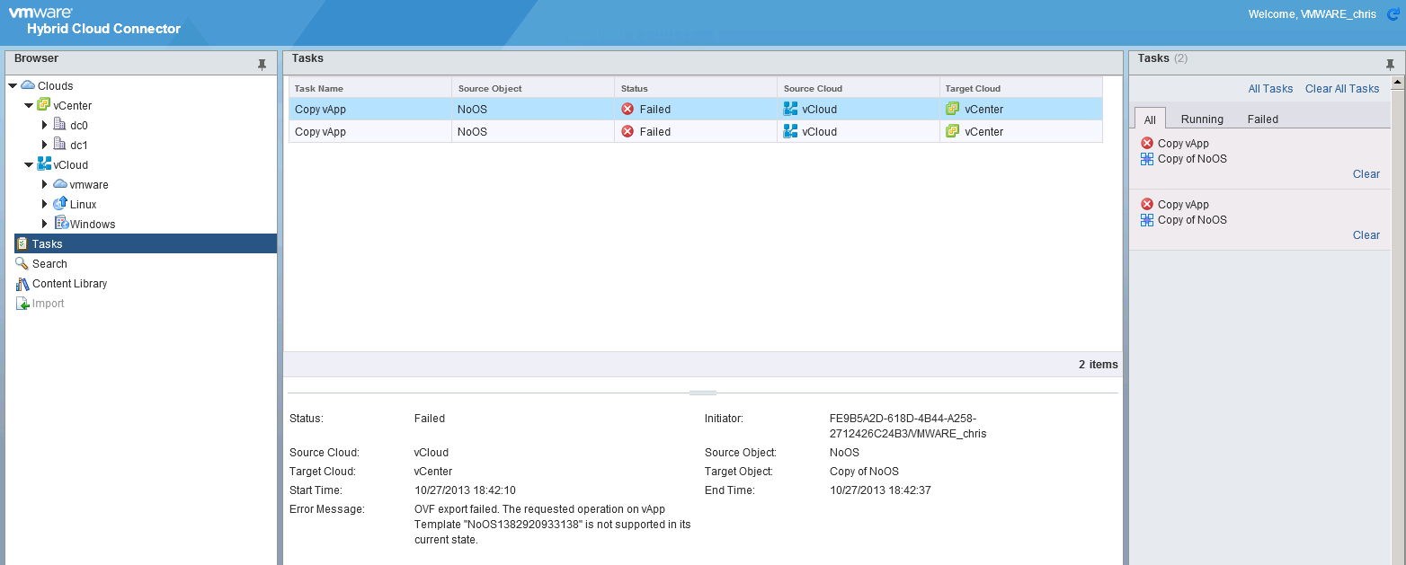 I was recently working with vCloud Connector (vCC) 2.5 and ran into a couple of issues. I have a support request open with VMware for both issues and engineering is looking into the issue. If I receive a resolution, I’ll update this post.