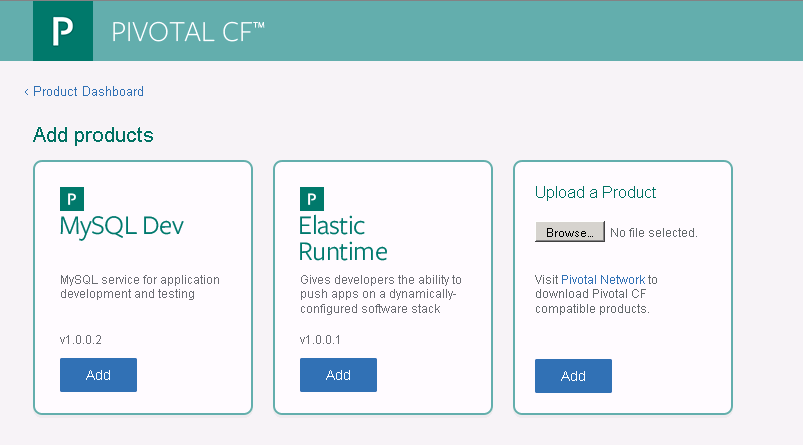 Go back to the Product Dashboard, select Add Product and Add on Elastic Runtime.