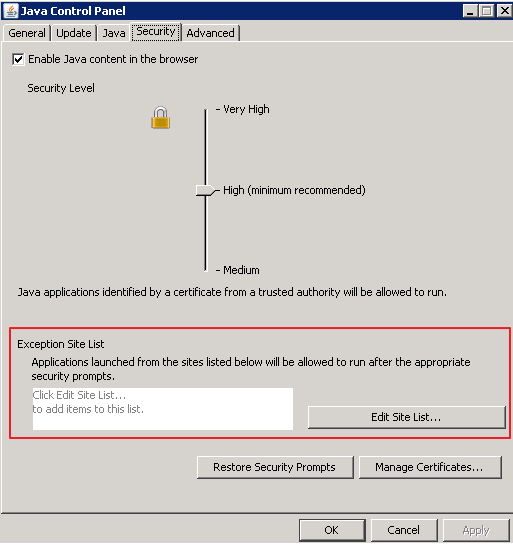 Now with only the current Java installed, we can go to the control panel and make our security changes. On Windows 7 to go Start > Control Panel > Java > Security tab. If you have correctly done everything above, you will see