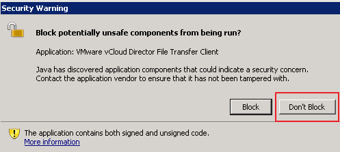 Choose “Don’t Block” and press cancel on the current vCloud window. Now try to download the template again and you should receive your OS’s program that allows you to choose the OVF destination.