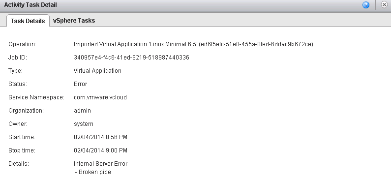 I was trying to deploy an OVA into a new vCloud 5.5 instance in my lab and it kept failing with the error “Internal Server Error: Broken Pipe”.