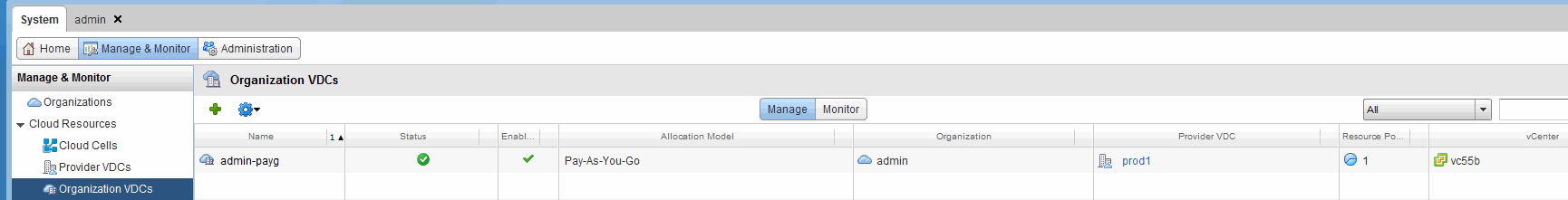 We see that the vCloud org vDC ‘admin-payg’ is mapped to a vCenter resource pool with a moref of 302.
