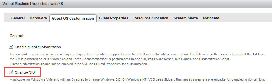 VMs in vCloud Director will be sysprepped if “Changed SID” is enabled. “Enable guest customization” must be selected as well for any guest customization to occur.