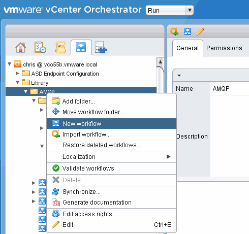 From anywhere within the vCO client, right-click a folder and select New workflow: