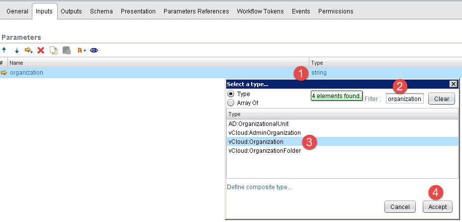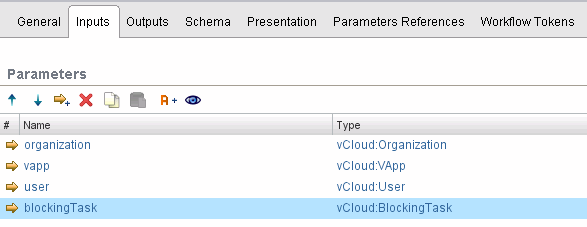 Select the IN tab and select organization, vapp, blockingTask and user: