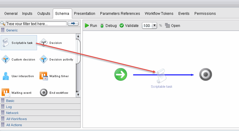 Select the Schema tab and drag a Scriptable task object from the Generic group onto the blue line between the Start and End elements: