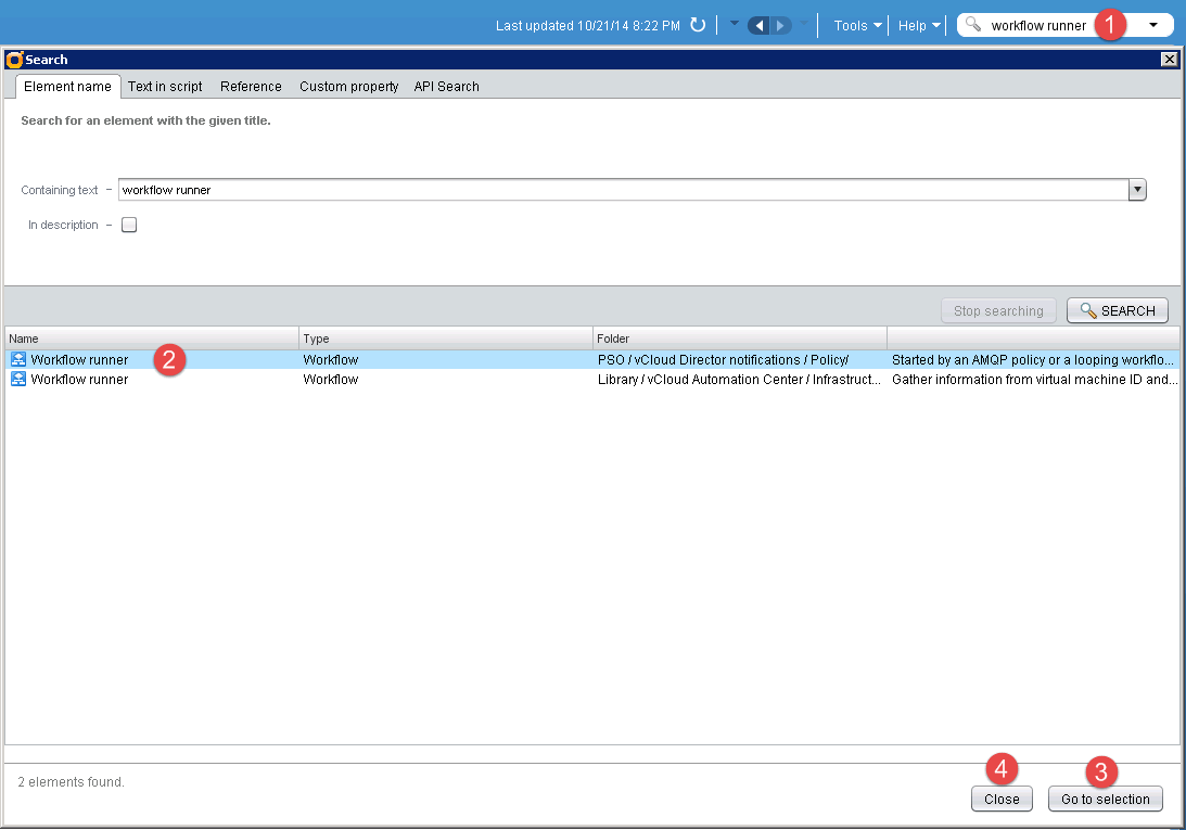 - Entering Workflow runner in the search box in the upper-right corner of the vCO client.