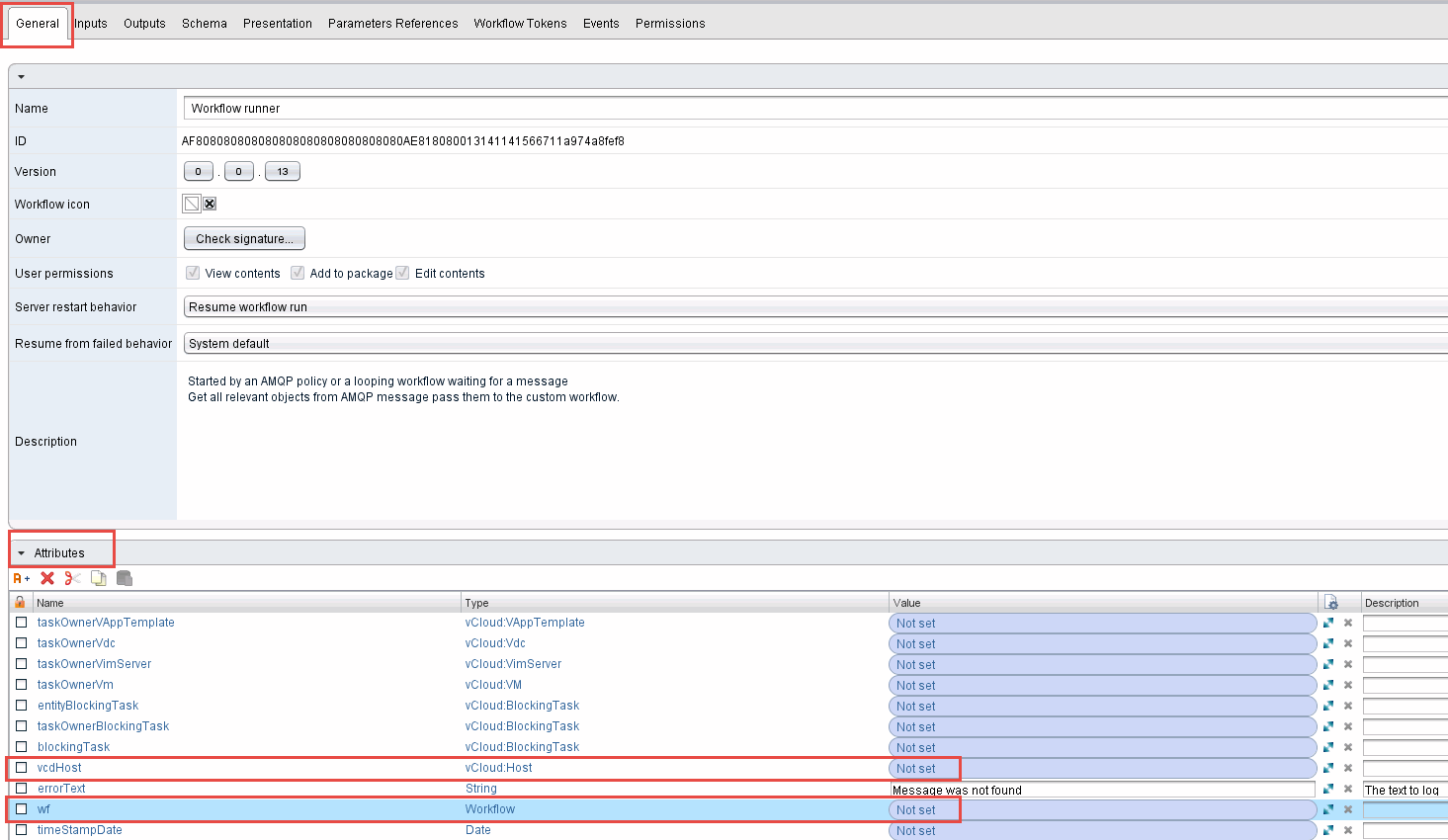 Edit the workflow and on the General tab under attributes we want to set vcdHost and wf. Here we can see that they are both not set:
