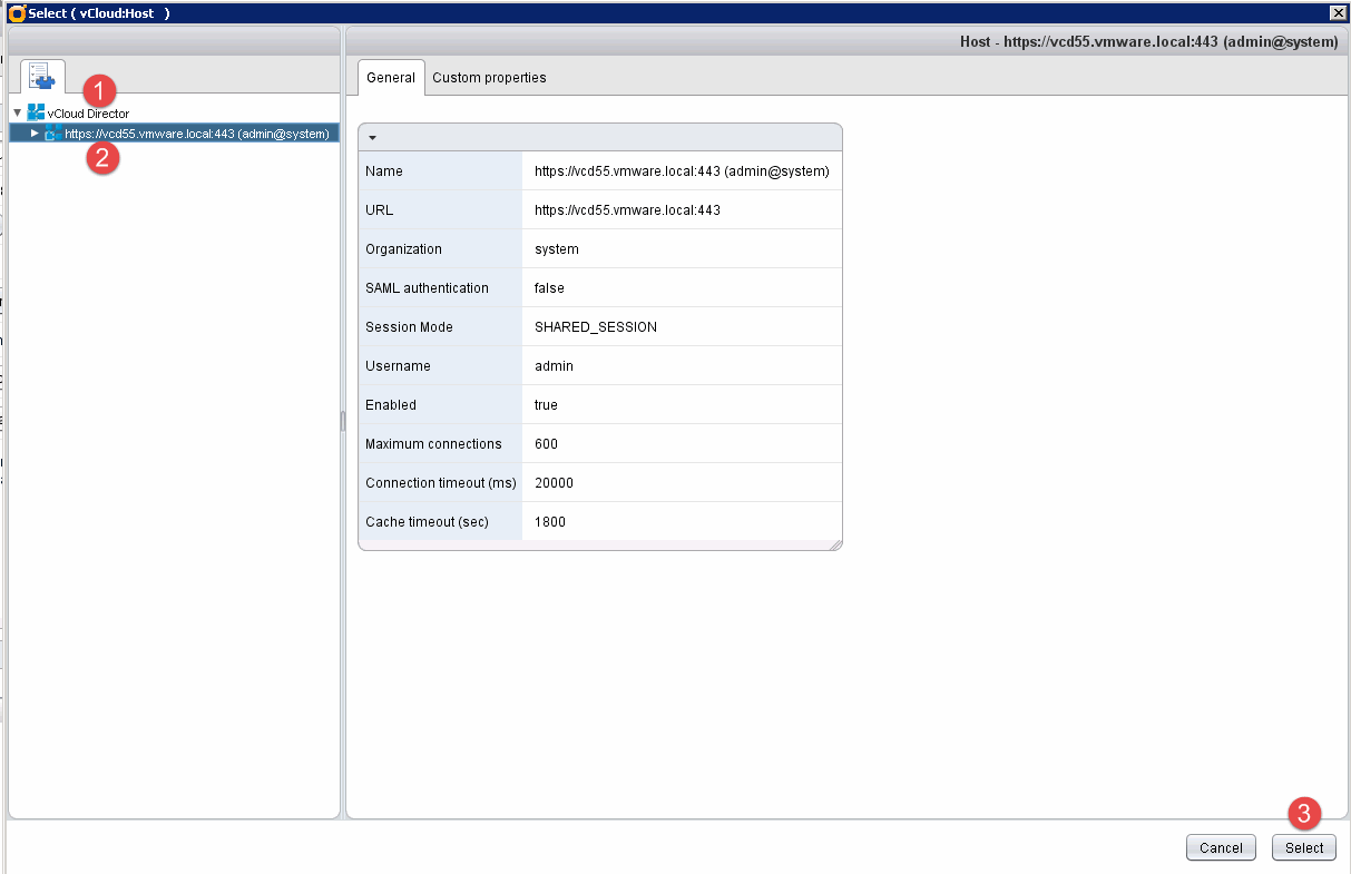 - Select your vCloud Director host. Mine is vcd55.vmware.local