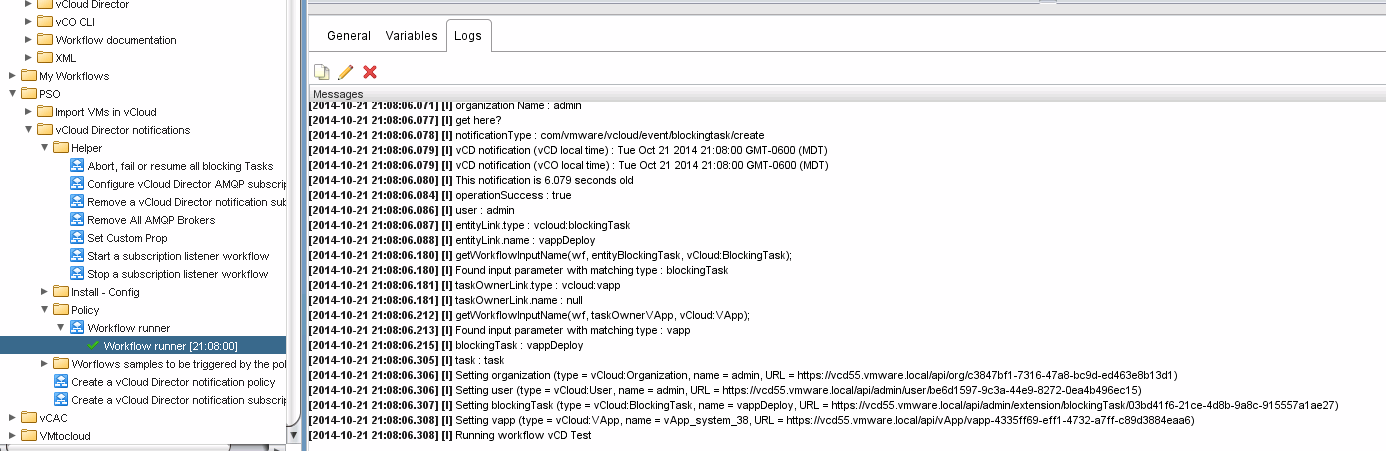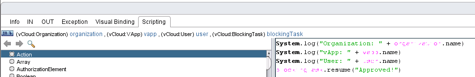 We can see the same thing with the vcd Test worflow that we ran. We simply display a few attributes and resume the blocking task, which tells vCloud Director that it can continue with starting the vApp: