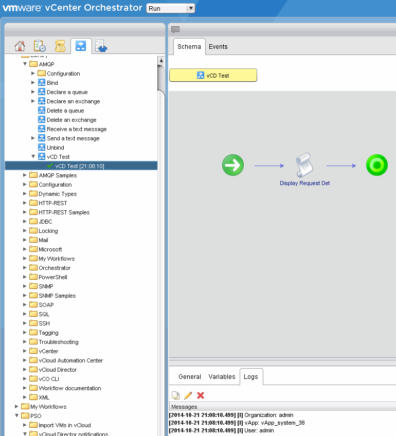In this post we will create the workflow that will run when vCD sends a message to the AMQP server. At the end we will see the data that vCloud passes to the workflow. We will simply print out some of this data, but this info can be used in many ways. For example, it could be used for a provisioning process that performs various tasks such as creating a computer object in AD, creating an IP/DNS entry, registering the VM in a configuration management tool, etc. This is what we do in our private cloud. Users log into vCloud Director, select their VM and from there vCO talks to all the necessary components to get the VM ready for the user.