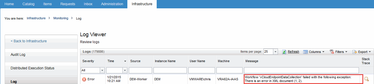 Workflow ‘vCloudEndpointDataCollection’ failed with the following exception: There is an error in XML document (1, 2).