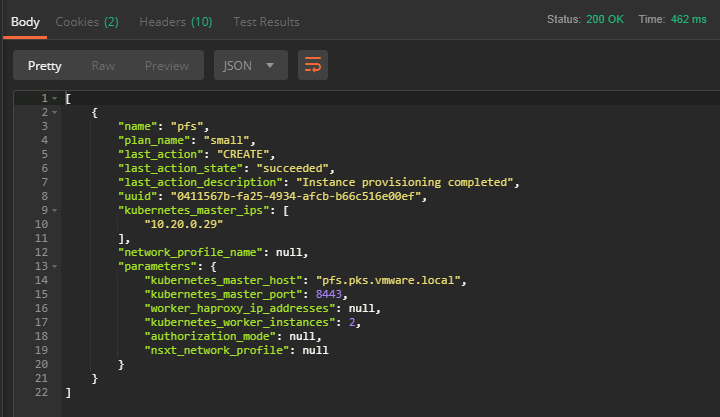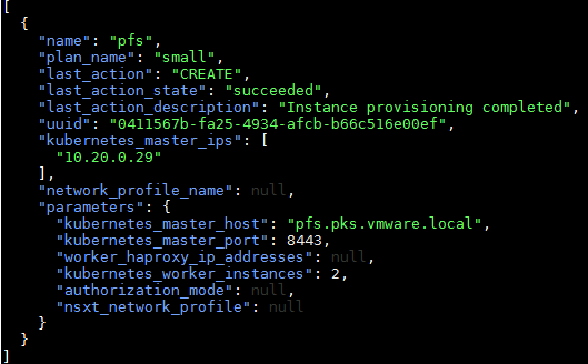 curl -s -k -H “Authorization: Bearer ${BEARER_TOKEN}” -H “accept: application/json” -X GET https://uaa.pks.vmware.local:9021/v1/clusters | jq