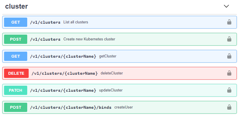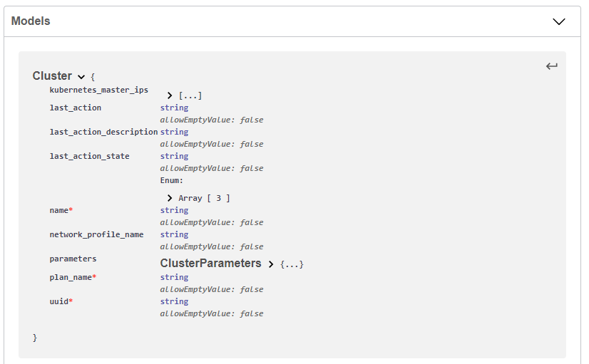 You can access the PKS Swagger definition at https://PKS_API_HOSTNAME:9021/v2/api-docs. You can find the PKS API hostname in Ops Manager > PKS Tile > PKS API > API Hostname. In my environment, this address is https://uaa.pks.vmware.local:9021/v2/api-docs. Unfortunately when you access this page you won’t see a nicely formatted page and will just see a bunch of JSON. I’m not sure if there is another path that will display the data nicely but for now you can copy the JSON and paste it into something like https://editor.swagger.io/. You will probably see a bunch of errors at the top but you can ignore them and scroll down to cluster where you’ll see the following: