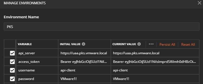 curl -s https://uaa.pks.vmware.local:8443/oauth/token -k -XPOST -H ‘Accept: application/json;charset=utf-8’ -u “api-client:VMware1!” -H ‘Content-Type: application/x-www-form-urlencoded;charset=utf-8’ -d ‘grant_type=client_credentials’ | jq -r .access_token