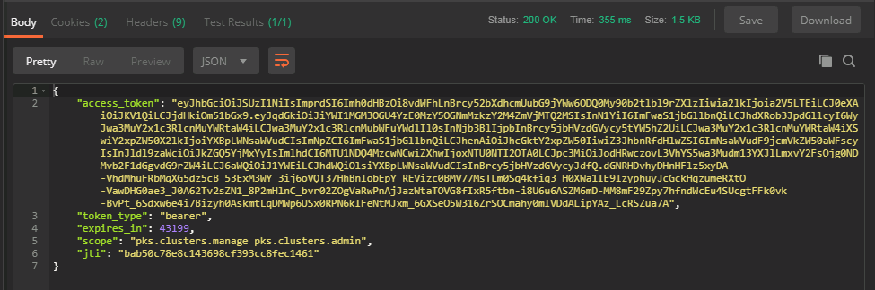 curl -s https://uaa.pks.vmware.local:8443/oauth/token -k -XPOST -H ‘Accept: application/json;charset=utf-8’ -u “api-client:VMware1!” -H ‘Content-Type: application/x-www-form-urlencoded;charset=utf-8’ -d ‘grant_type=client_credentials’
